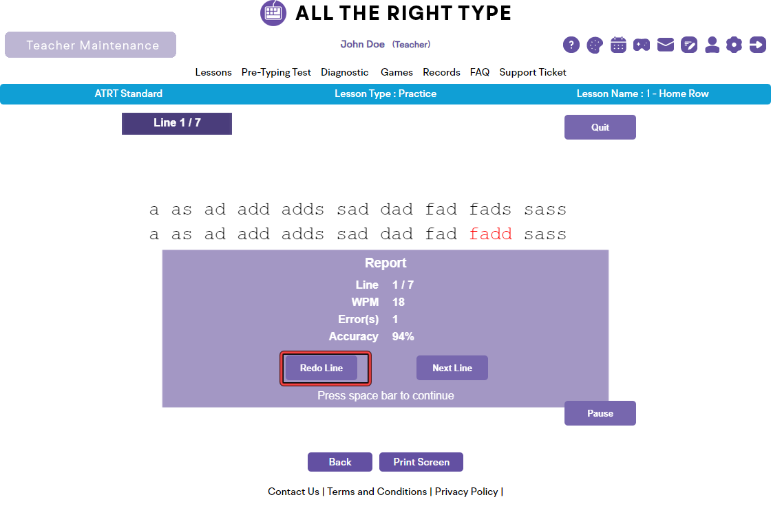 and get immediate feedback finger analysis. A critical ATRT advantage is the letter-by-letter error checking to report the individual finger to the user should focus on. The program will prompt users to redo the lesson if they have not achieved the level of accuracy set by the account administrator.